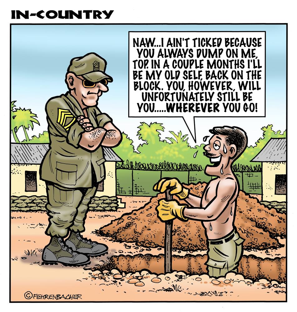 Phil enlisted in the Army in 1965 where you served for years in Vietnam. He became a graphic designer and has worked for the state of Oregon for 26 years. He retired in 2003 and started the Cartoon "In-Country". The cartoons reflect his experiences during his tour of duty in South Vietnam.