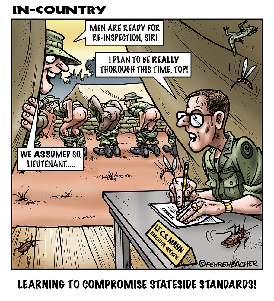 Phil enlisted in the Army in 1965 where you served for years in Vietnam.  He became a graphic designer and has worked for the state of Oregon for 26 years.  He retired in 2003 and started the Cartoon "In-Country".  The cartoons reflect his experiences during his tour of duty in South Vietnam.